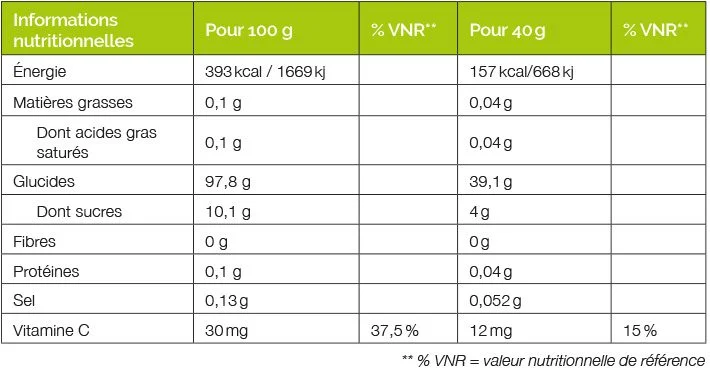 | 🍃 Ingrédients clés | Manioc maltodextrine*, sucre de fleur de coco*, extrait d’acérola (vitamine C naturelle) (*ingrédients issus de l’agriculture biologique) |