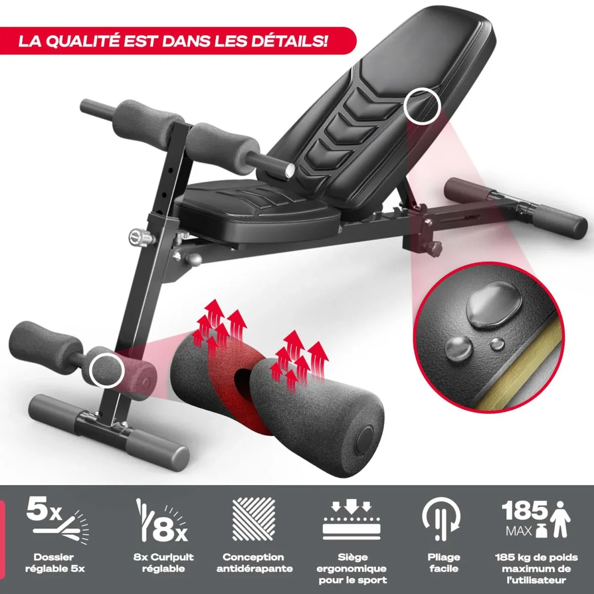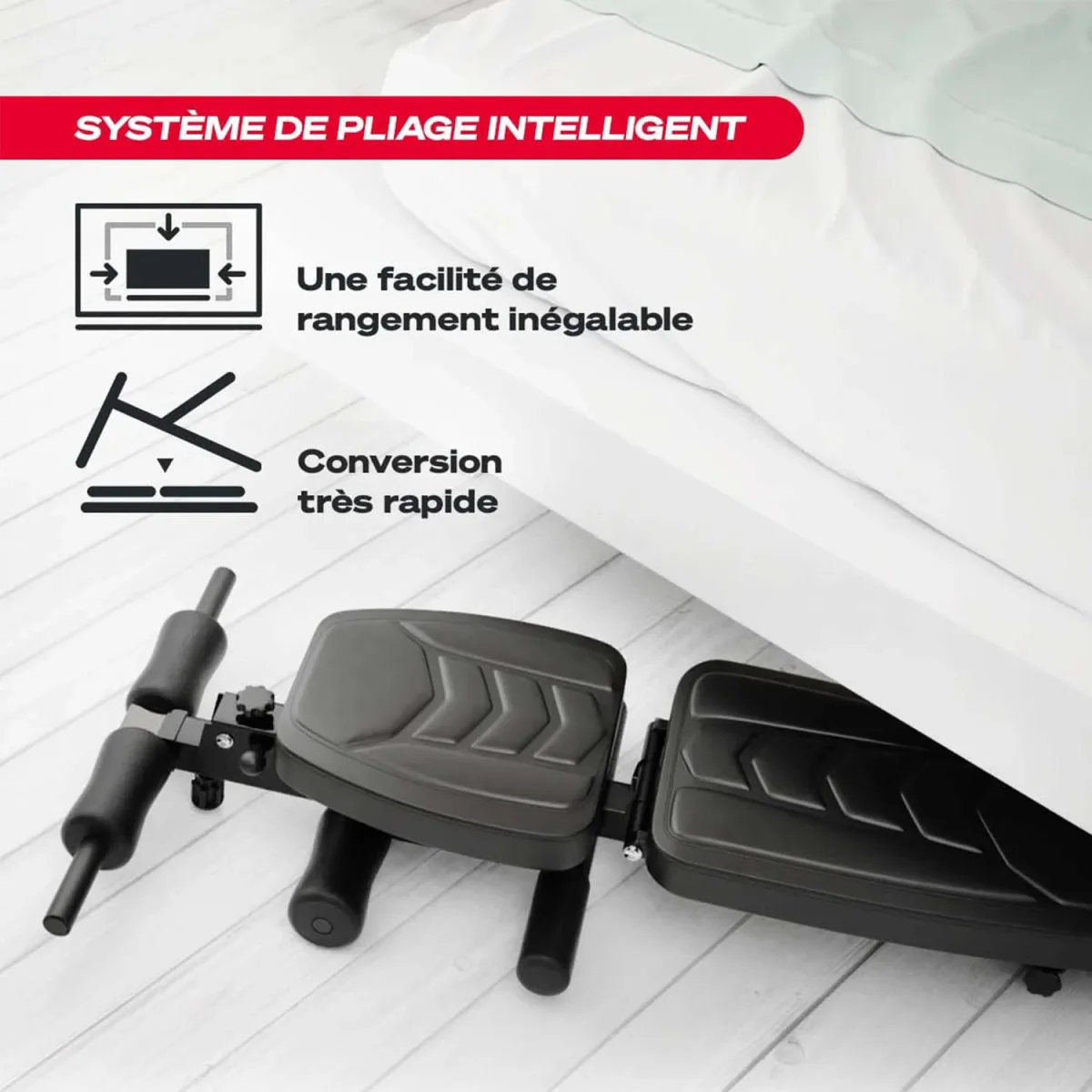 Son dossier réglable sur 5 positions (droite, inclinée et négative) offre une grande polyvalence, tandis que son rembourrage EVA ergonomique assure confort et durabilité. Son système de pliage intelligent permet un rangement ultra-compact, idéal pour les petits espaces. Conçu avec un cadre en acier robuste et des pieds antidérapants, il garantit sécurité et stabilité pendant vos séances.