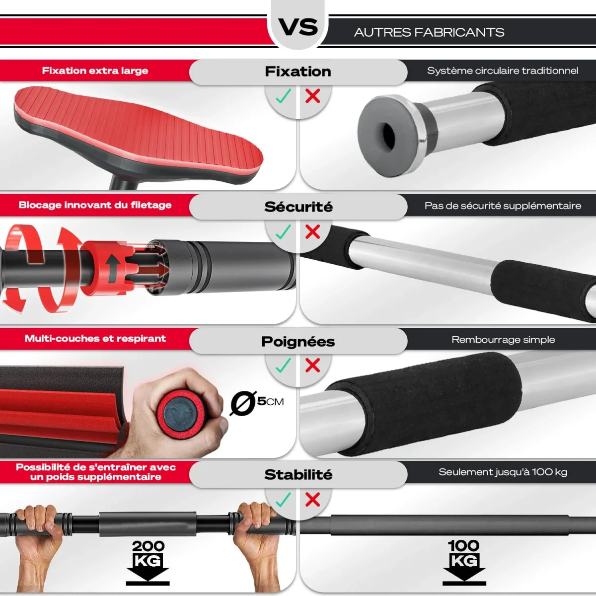 Sa construction en acier ultra-résistant supporte jusqu’à 200 kg, garantissant une stabilité optimale. Idéale pour les tractions, pompes et exercices abdominaux, elle permet de renforcer le haut du corps en toute simplicité.