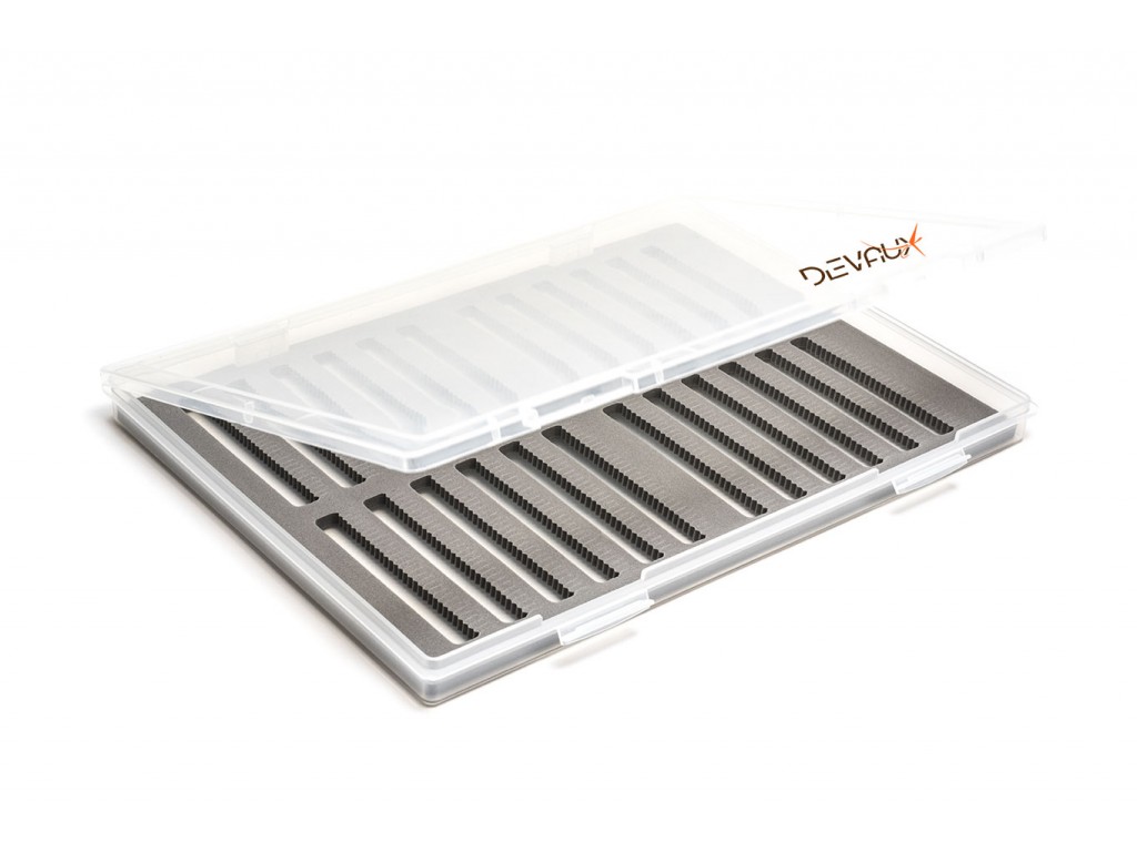 Boîte conçue pour la pêche en réservoir conciliant un encombrement minimum et une extrême légèreté. 12 doubles bandes de mousse haute densité rainurée pour une très importante capacité de 350 mouches.