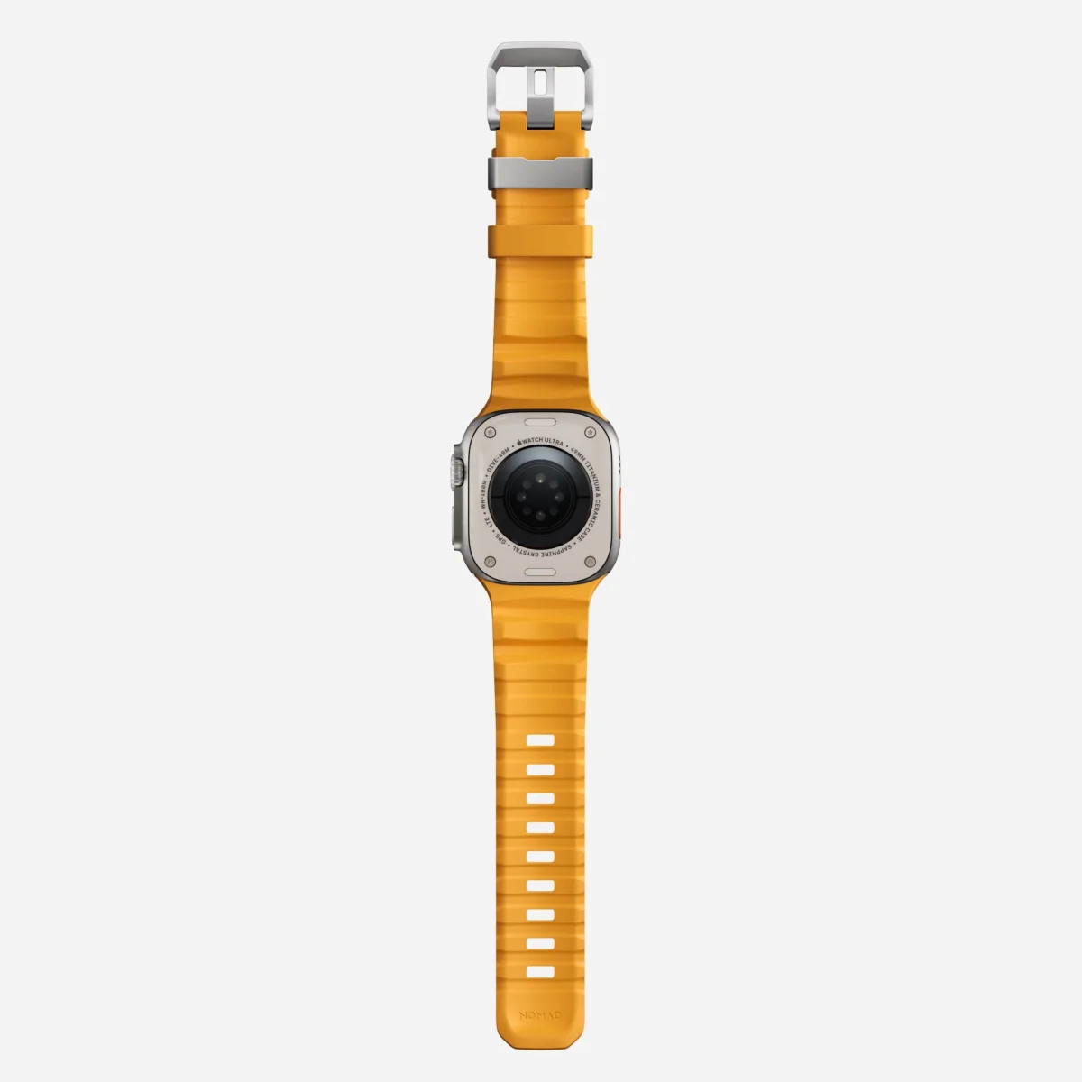 Conçu pour les amateurs d’aventure et de sport, ce bracelet en fluoroélastomère FKM ultra-résistant est 100 % étanche et offre une excellente respirabilité grâce à ses rainures d’aération. Léger et robuste, il est équipé d’adaptateurs en titane pour une solidité maximale et un maintien parfait en toutes circonstances.