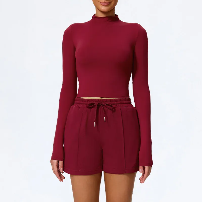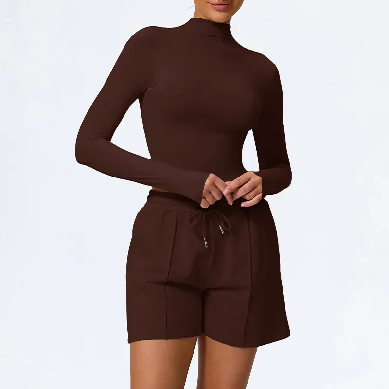 Tee-shirt technique et short taille élastique pour une pratique fluide et élégante. Maille nylon/spandex tricotée, douce sur la peau, extensible et opaque. Ensemble Yoga Femme Zen Short Long idéal pour le yoga, le pilates et l’entraînement.
