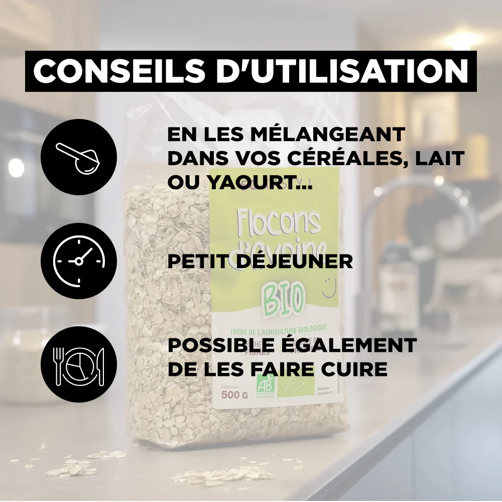 FLOCONS D’AVOINE BIO est très facile à préparer pour chacun des repas, du petit-déjeuner au dîner. Pour vos shakes à emporter dans un sac de sport préférez les flocons en poudre.
