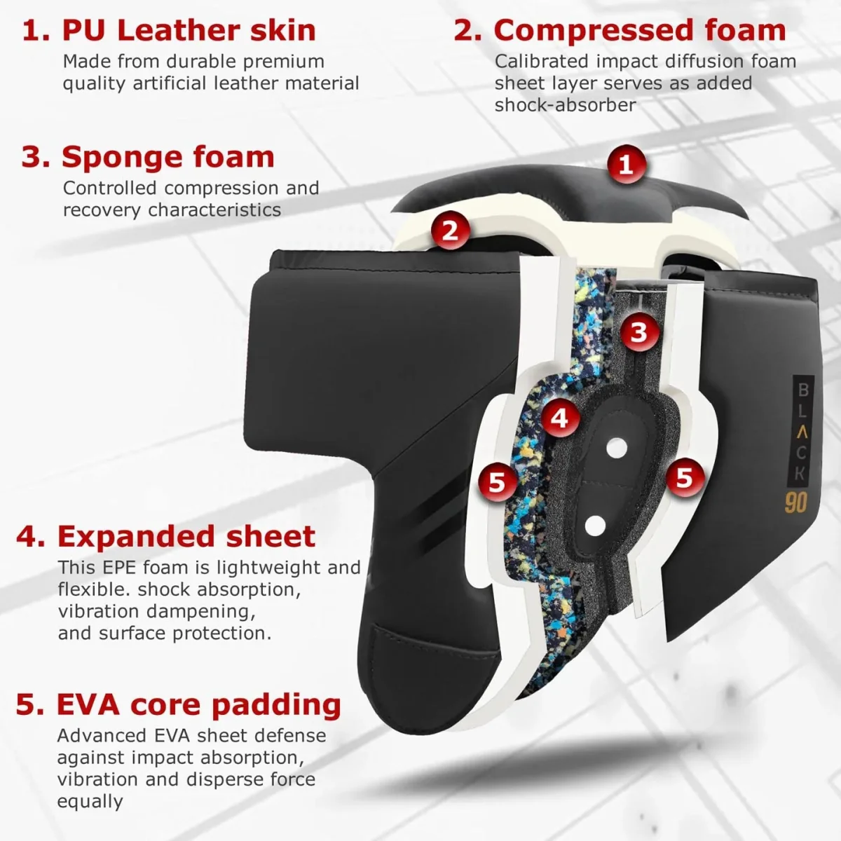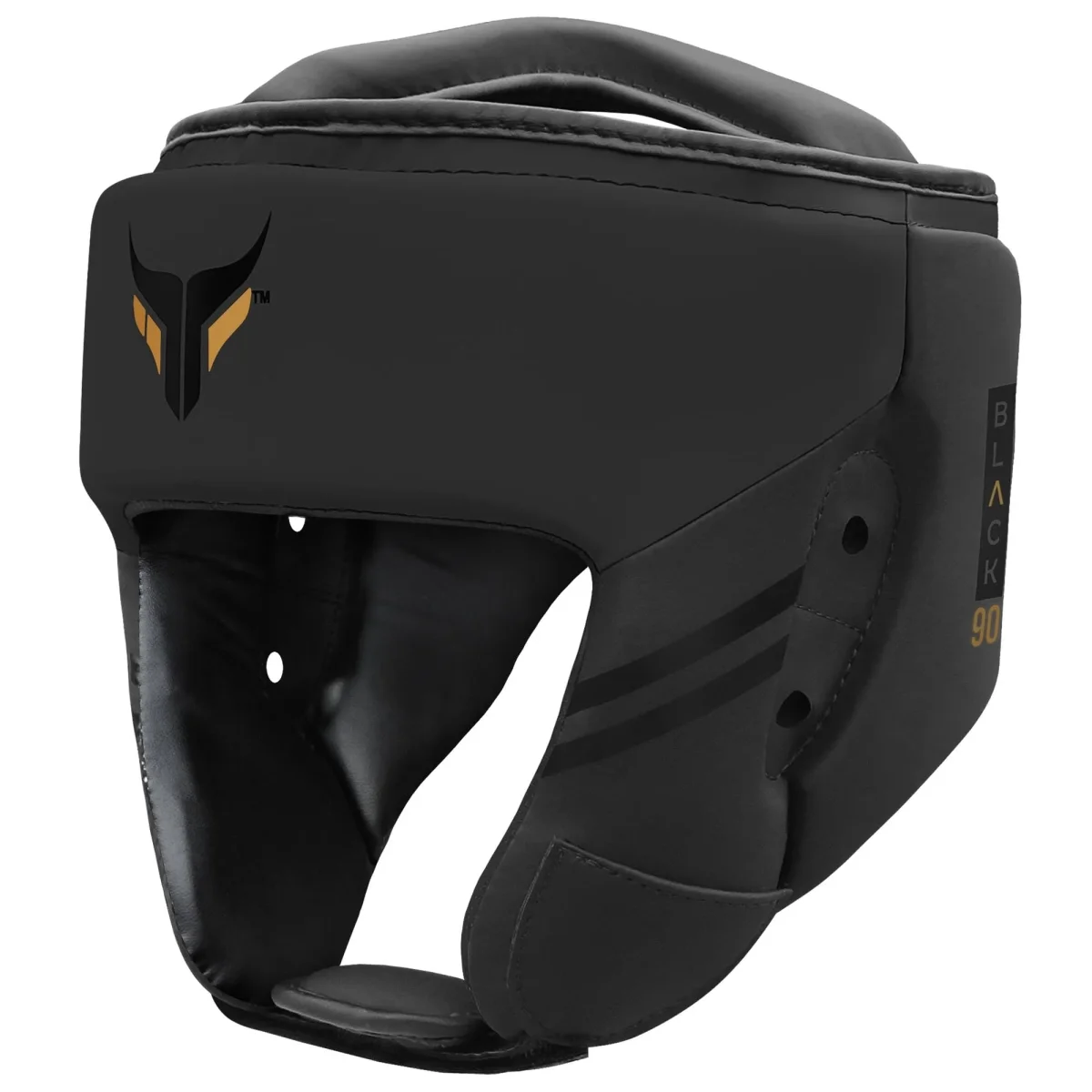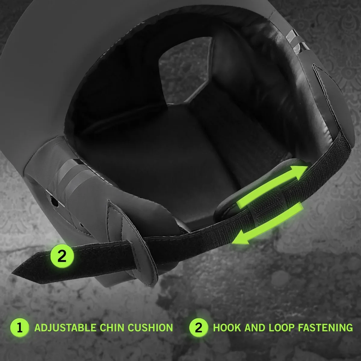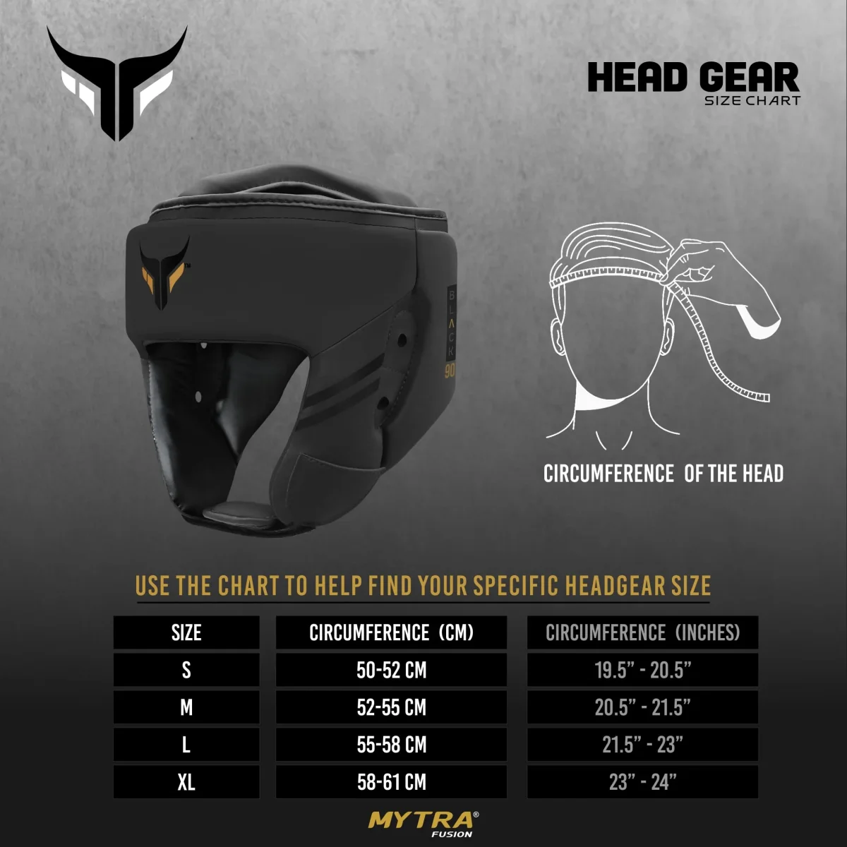 Mytra Fusion Black-90 Open Face Head Guard. Made from premium simili cuir, this headgear provides full coverage for the head, and ears. Equipped with three layers of advanced padding, it absorbs impact and minimizes injuries, making it ideal for boxing, kickboxing, MMA, Muay Thai, and grappling sports.