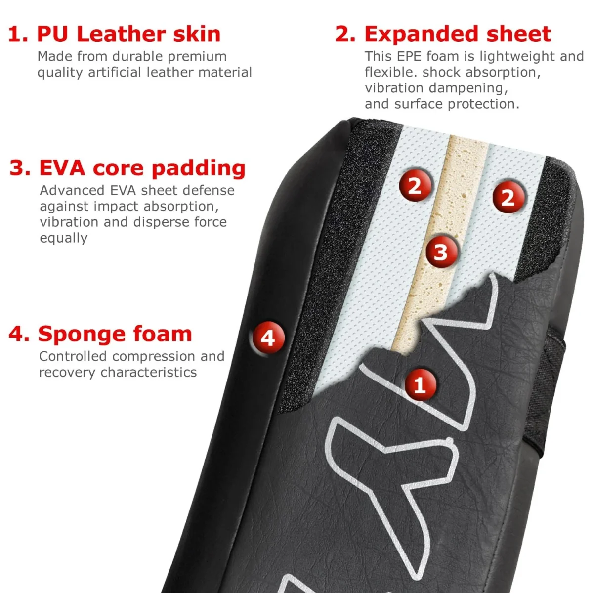 - High-density foam minimizes the force of punches and kicks.