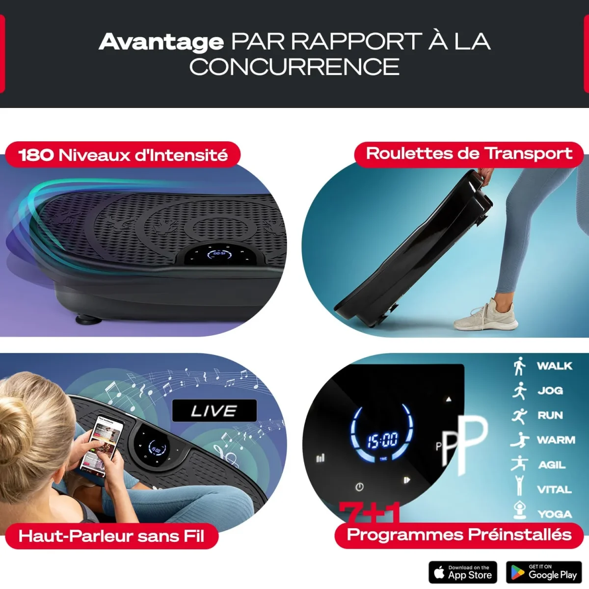 Découvrez la Plateforme vibrante HomeFit, un appareil compact et puissant conçu pour un entraînement efficace à domicile. Grâce à son moteur de 200W et sa technologie d’oscillation innovante, elle stimule en profondeur vos muscles avec 180 niveaux d’intensité et 7 programmes automatiques.