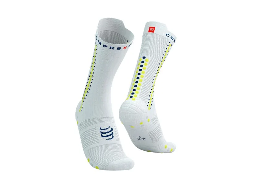 Intégralement repensée pour améliorer les performances aérodynamiques et le confort, la toute nouvelle Pro Racing Sock Bike apporte de nouveaux niveaux de soutien, de vitesse et de ventilation pour vos longues journées en selle. Un tissage rayé autour du pied et à l’arrière de la chaussette évacue rapidement la transpiration et l’humidité pour garder les pieds frais et secs à tout moment. La zone des orteils, totalement repensée et plus large, offre une meilleure proprioception lors du coup de pédale. Notre soutien de la voûte plantaire offre un bon maintien, stimule la circulation sanguine et empêche les torsions ou les plis du tissu : plus de points chauds ou d’irritation lors des longs trajets. Deux lignes de 3D.Dots s’étendent jusqu’à la moitié du tendon d’Achille et vous apportent un soutien supplémentaire lorsque vous vous levez de la selle. Elles entourent une rangée de Flat.Dots flambant neufs pour une meilleure ventilation. Sous le pied, un motif 3D.Dots et Flat.Dots en proportion égale offre une meilleure adhérence dans la chaussure ainsi qu’une légère microstimulation, pour activer le retour veineux et retarder la fatigue. Les côtés de la chaussette sont dotés de la toute nouvelle technologie Aero.dots, de la malléole à la couture, qui dirige le flux d’air pour réduire les turbulences à l’arrière de la chaussette et diminuer la résistance lorsque la vitesse augmente. La coupe, plus haute que nos modèles de trail et de running, est conçue spécifiquement pour les performances et l’esthétique du cyclisme tout en restant dans les limites de l’UCI. L’élégante languette à l’arrière de la chaussette ajoute une touche de classe et la discipline est discrètement brodée à l’intérieur, au cas où vous hésiteriez au moment de choisir votre paire dans le tiroir à chaussettes. Testée sur des centaines de kilomètres sur la route, c’est votre nouvelle chaussette de cyclisme préférée pour plus de classe et plus de vitesse dans le peloton, l’échappée ou tout simplement lors de votre sortie en groupe du dimanche.