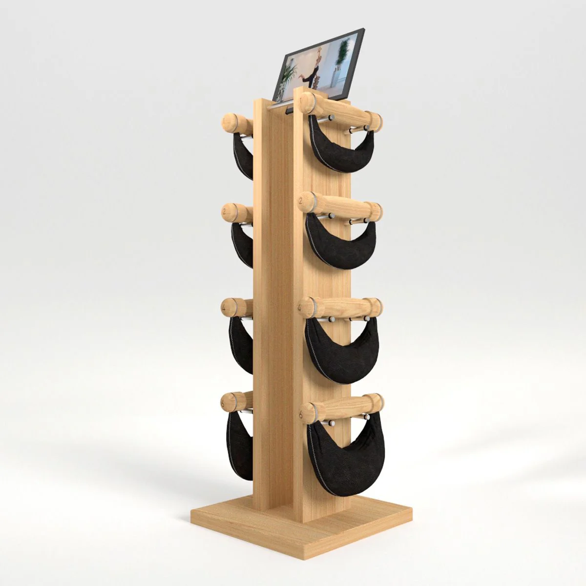La Tour NOHrD SWING contient huit planches d’entraînement, avec des exercices imprimés des deux côtés. Les exercices sont classifiés par niveau de difficulté, du plus facile au plus difficile. Les planches d’entraînement sont stockées dans la tour et en cas d’utilisation, peuvent être placées dans le support prévu à cet effet sur le couvercle pour faciliter la lecture.