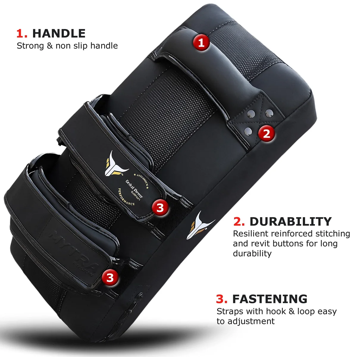 Mytra Fusion Tribal Power Thai Pad is a single, high-quality training pad designed for serious athletes. Made with premium artificial leather and featuring a striking all-black tribal design. It’s built with multi-layered, high-density padding for excellent impact absorption. The pad is 37cm x 21cm x 8cm and comes with a strong, reinforced handle and two adjustable hook and loop straps, offering a secure and comfortable grip. Ideal for Karate, MMA, Muay Thai, Kickboxing, Jiu-Jitsu, and more.